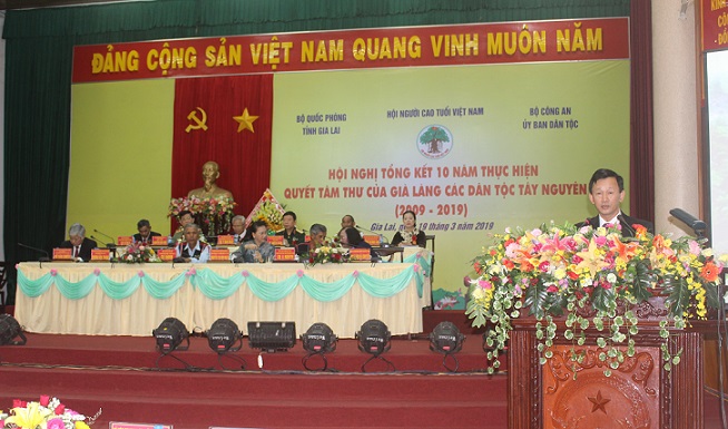 Đồng chí Đàm Hữu Đắc, Phó Chủ tịch Thường trực Trung ương Hội NCT Việt Nam báo cáo tổng kết 10 năm thực hiện Quyết tâm thư của Già làng các dân tộc khu vực Tây Nguyên (2009 - 2019)