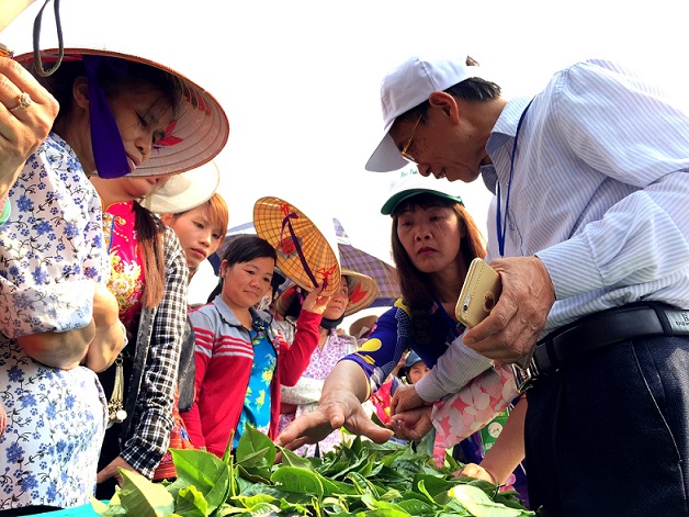 Ông Đỗ Như Vưu (bên phải) làm Trưởng ban Giám khảo Hội thi Hái chè tại huyện Mộc Châu