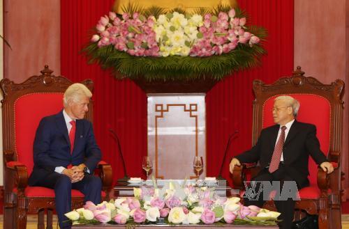 Tổng Bí thư Nguyễn Phú Trọng hoan nghênh nguyên Tổng thống Clinton trở lại thăm Việt Nam; đánh giá cao những đóng góp của nguyên Tổng thống và Phu nhân Hillary Clinton (Hi-la-ri Clin-tơn) trong quá trình dỡ bỏ cấm vận thương mại, bình thường hóa và tích cực thúc đẩy quan hệ song phương Việt Nam - Hoa Kỳ trong 20 năm qua, đặc biệt là các hoạt động của Quỹ Clinton trong việc hỗ trợ Việt Nam xóa đói, giảm nghèo, khắc phục hậu quả chiến tranh, y tế, bảo vệ môi trường ...