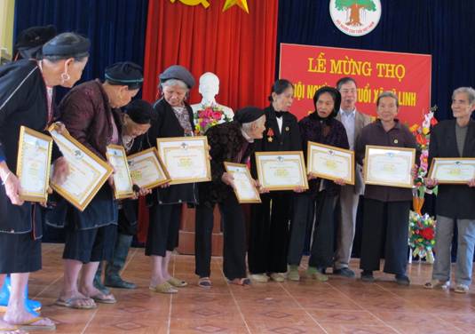 Đồng chí Ngô Trọng Vịnh, Phó Chủ tịch TW Hội NCT Việt Nam chúc thọ 14 Cụ, tại khu 10, thị trấn Thanh Ba, tỉnh Phú Thọ, trong đó cụ Vũ Thị Minh 103 tuổi (mặc áo đỏ).