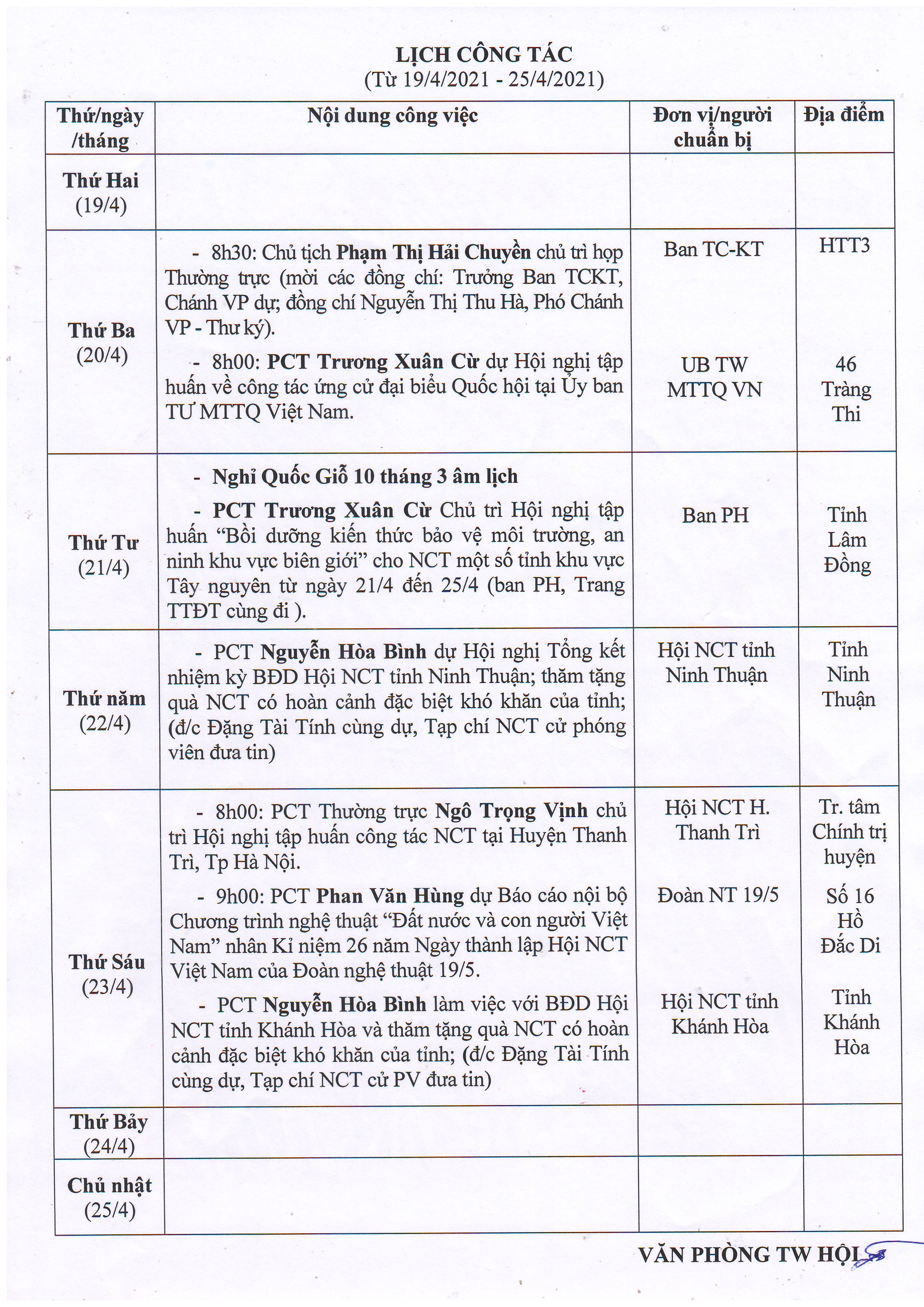 LỊCH CÔNG TÁC TUẦN (Từ ngày 19/4 - 25/4/2021)
